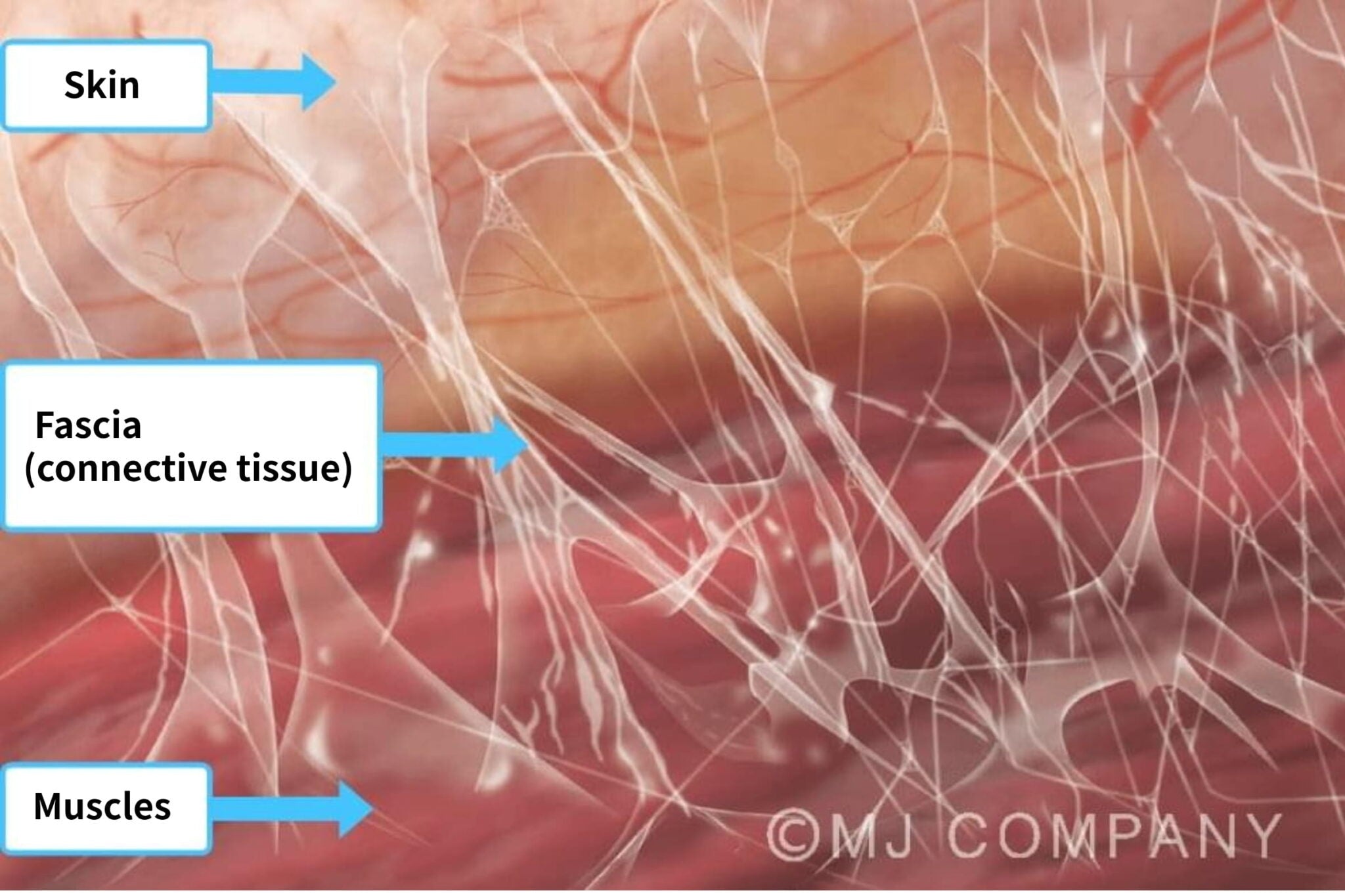 Fascia is a continuous web of connective tissue that surrounds, supports, and connects every muscle, bone, nerve, blood vessel, and organ in the body. It’s made primarily of collagen and elastin fibers suspended in fluid, forming a flexible, three-dimensional network that gives structure and coordination to movement.